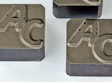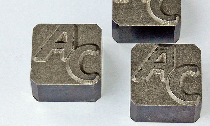 Electrode en cuivre (à droite) et pièce acier trempé usinée par enfonçage (à gauche)
