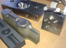 Electrode en graphite (à gauche) et pièce usinée par enfonçage ( à droite)