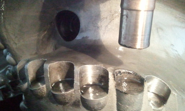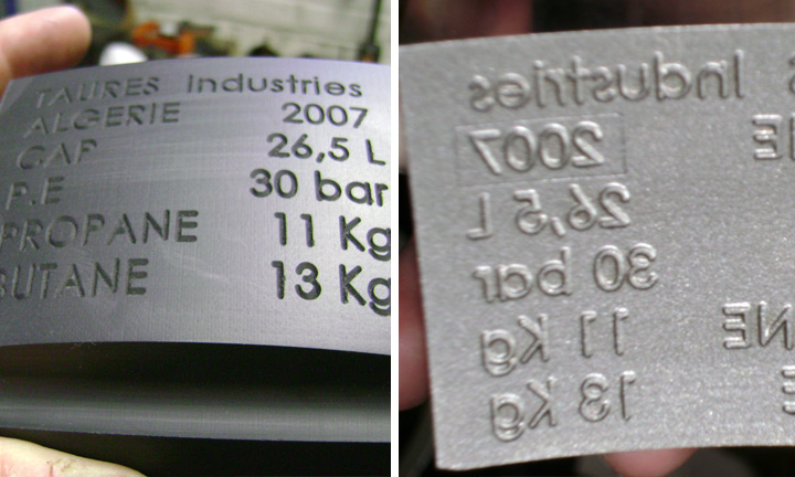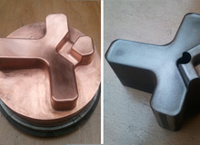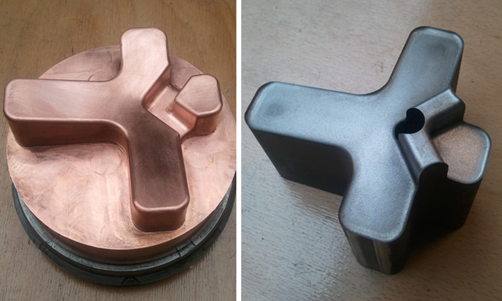 Electrode en cuivre (à droite) et pièce acier trempé usinée par enfonçage (à gauche)